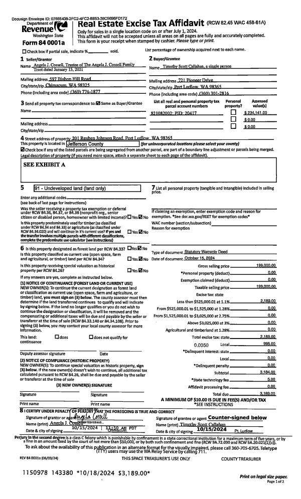 | 1 | 10/15/2024 | SWD | Statutory Warranty Deed | ANGELA J COSSELL FAMILY TRUST | TIMOTHY S CALLAHAN | | | $199,000.00 | 143380 | |