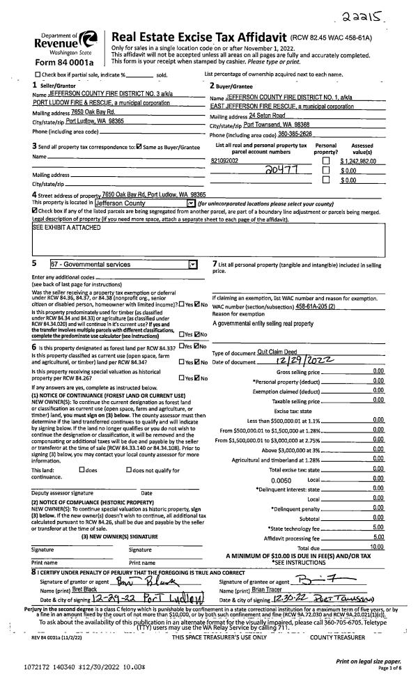| 1 | 12/29/2022 | QCD | Quit Claim Deed | JEFFERSON CO FIRE DISTRICT #3 | JEFFERSON CO FIRE DISTRICT #1 | | | | 140340 | |