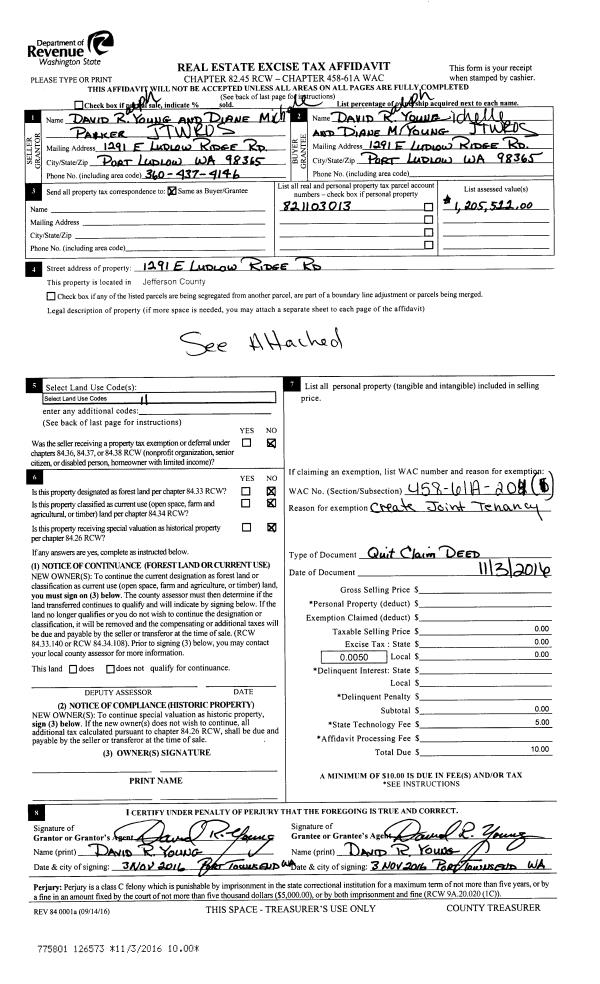 | Mailing Address: | DAVID R YOUNG TRUSTEE 1291 E LUDLOW RIDGE RD PORT LUDLOW, WA 98365-9534 | % Ownership: | 100.0000000000% |