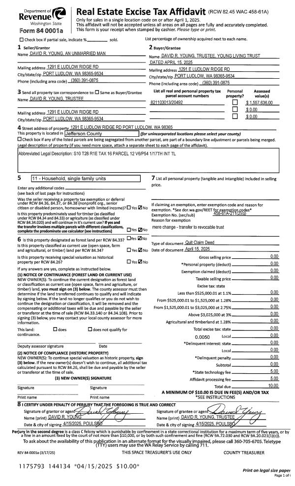 | 1 | 04/15/2025 | QCD | Quit Claim Deed | DAVID R YOUNG | YOUNG LIVING TRUST | | | | 144134 | |
