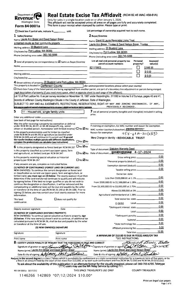 | 2 | 04/17/2024 | SWD | Statutory Warranty Deed | DAVID & LAURIE BREIER | DAVID & LAURIE REVOCABLE LIVING TRUST | | | | 142869 | |