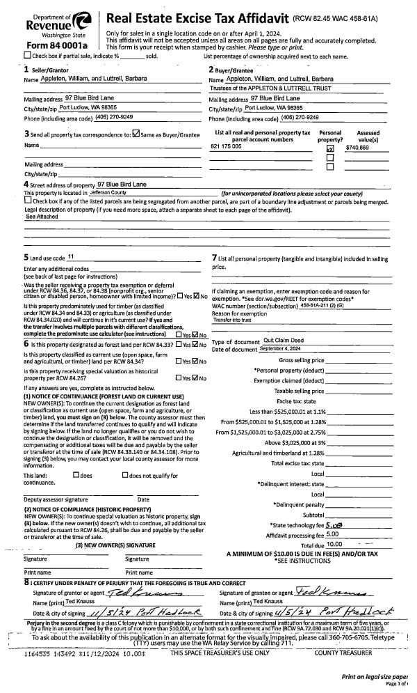 | Mailing Address: | WILLIAM APPLETON TRUSTEE BARBARA LUTTRELL TRUSTEE 97 BLUE BIRD LN PORT LUDLOW, WA 98365-9318 | % Ownership: | 100.0000000000% |