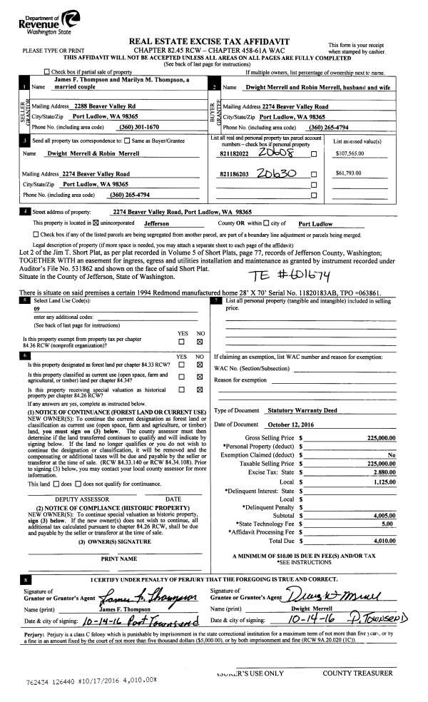 | 4 | 10/12/2016 | SWD | Statutory Warranty Deed | JAMES F & MARILYN M THOMPSON | DWIGHT & ROBIN MERRELL | | | $225,000.00 | 126440 | |