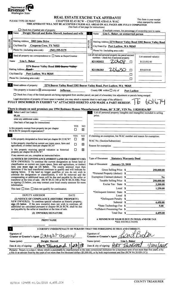 | 3 | 01/23/2018 | SWD | Statutory Warranty Deed | DWIGHT & ROBIN MERRELL | LISA L BAKER | | | $250,000.00 | 129455 | |