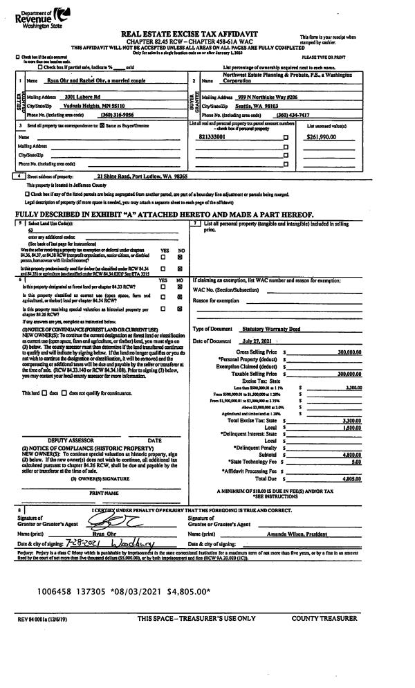 | 2 | 07/27/2021 | SWD | Statutory Warranty Deed | RYAN & RACHEL OHR | NORTHWEST ESTATE PLANNING & PROBATE | | | $300,000.00 | 137305 | |