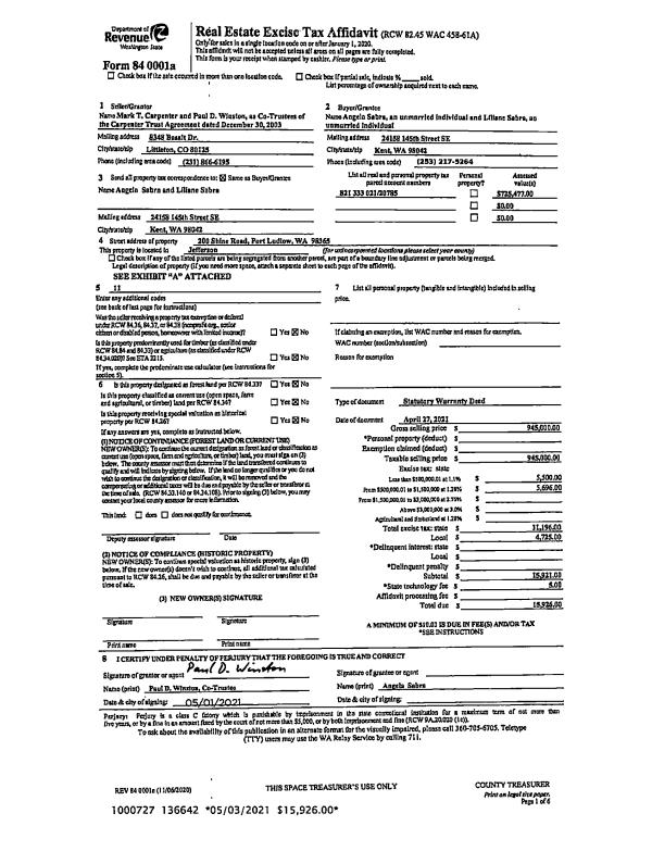 | 1 | 04/27/2021 | SWD | Statutory Warranty Deed | THOMAS L CARPENTER TR | ANGELA SABRA | | | $945,000.00 | 136642 | |