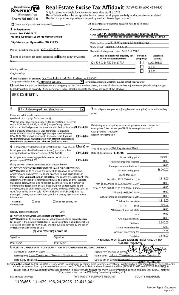| 1 | 06/24/2025 | SWD | Statutory Warranty Deed | JANET ADY FAMILY TRUST | BARBARA J MILLER REVOCABLE TRUST | | | $165,000.00 | 144479 | |