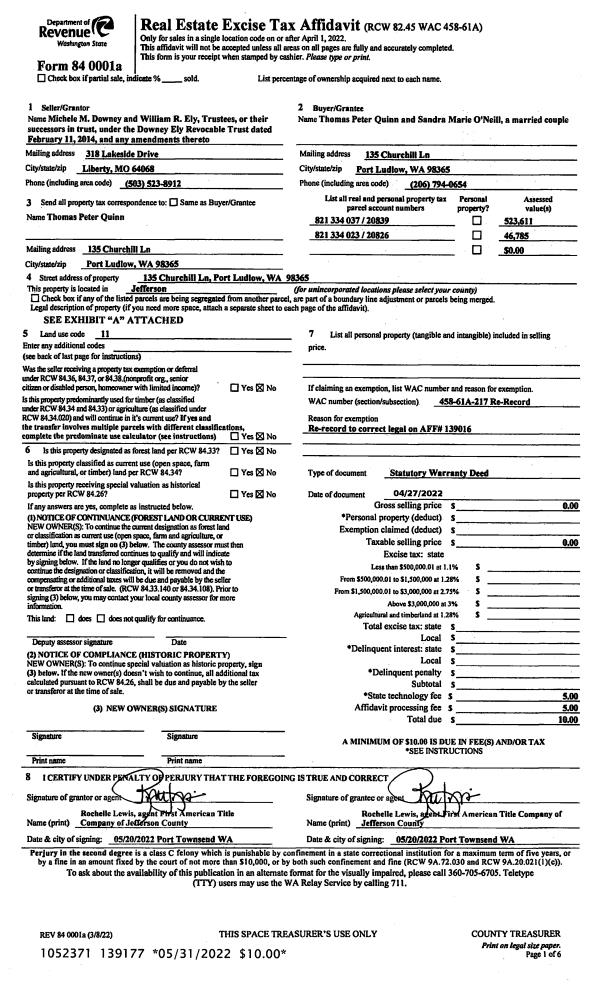 | 1 | 04/27/2022 | SWD | Statutory Warranty Deed | DOWNEY ELY REVOCABLE TRUST | THOMAS P QUINN & SANDRA M O'NEILL | | | $1,450,000.00 | 139016 | |