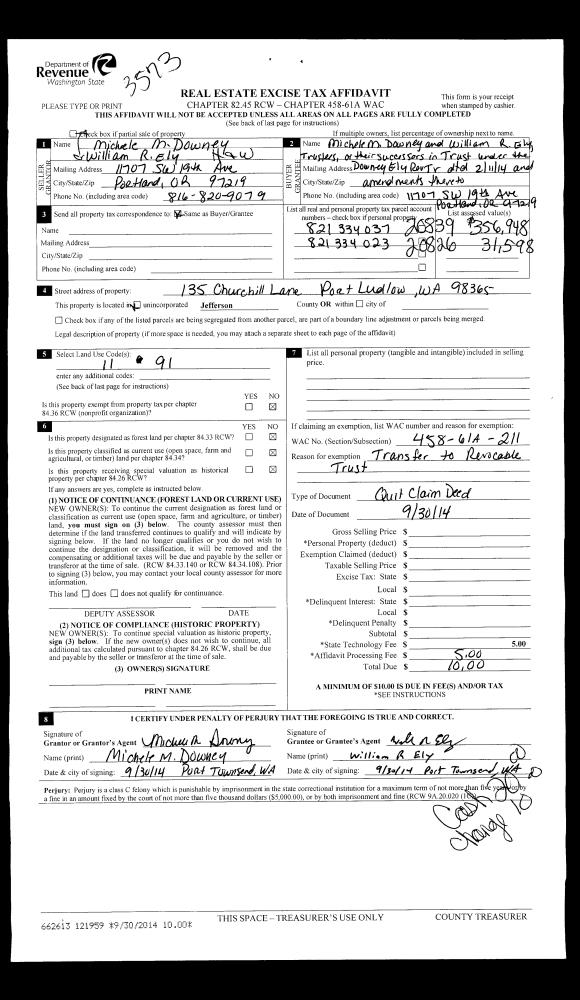 | 3 | 09/30/2014 | QCD | Quit Claim Deed | WILLIAM R ELY & MICHELE M DOWNEY | DOWNEY ELY REVOCABLE TRUST | | | | 121959 | |