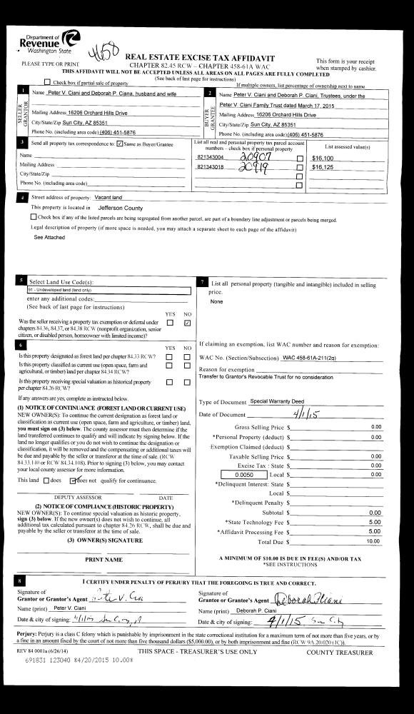| 2 | 04/01/2015 | SPWD | Special Warranty Deed | PETER V CIANI | PETER V CIANI FAMILY TRUST | | | | 123040 | |