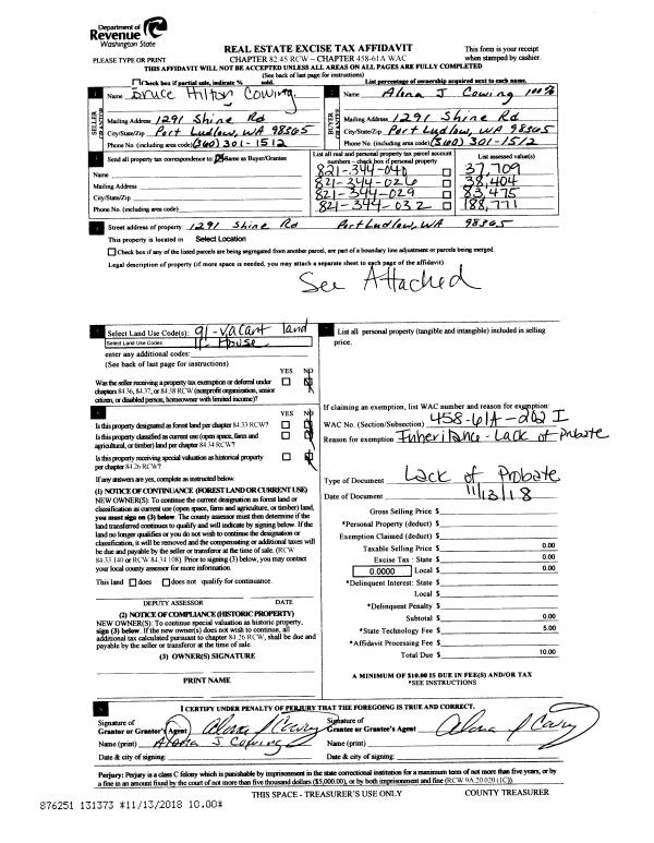 | 5 | 11/13/2018 | LOP | Lack of Probate | BRUCE H COWING | ALONA J COWING | | | | 131373 | |