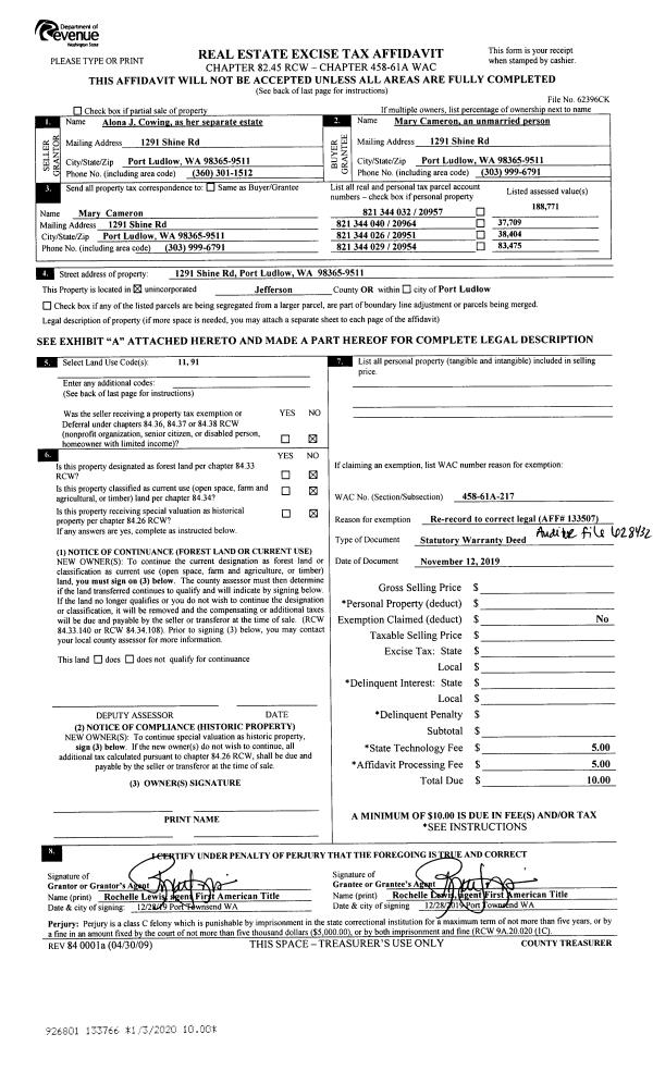 | 3 | 11/12/2019 | SWD | Statutory Warranty Deed | ALONA J COWING | MARY CAMERON | | | | 133507 | |