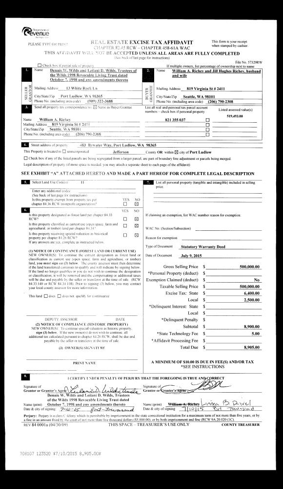 | 1 | 07/09/2015 | SWD | Statutory Warranty Deed | WILDS REVOCABLE LIVING TRUST | WILLIAM & JILL RICHEY | | | $500,000.00 | 123520 | |