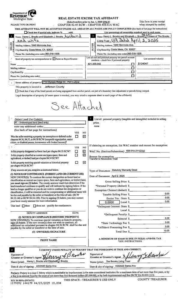 | 1 | 04/02/2025 | SWD | Statutory Warranty Deed | HENRY L BROOKS | BROOKS LIVING TRUST | | | | 144179 | |