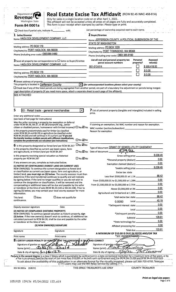 | 1 | 05/19/2022 | EASE | Assignment of Easement | HADLOCK DEVELOPMENT COMPANY | JEFFERSON COUNTY | | | $8,038.00 | 139136 | SEW/UTIL EASE |