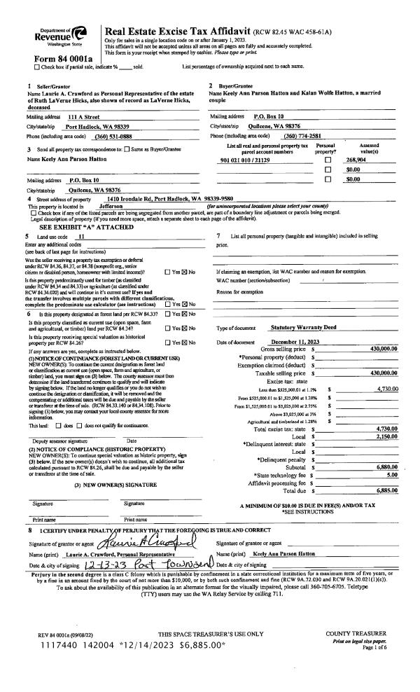 | 1 | 12/11/2023 | SWD | Statutory Warranty Deed | LAVERNE HICKS | KEELY A PARSON HATTON | | | $430,000.00 | 142004 | |