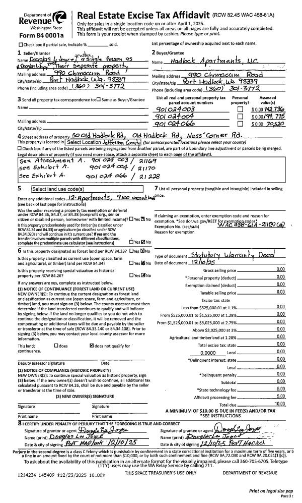 | 1 | 12/10/2025 | SWD | Statutory Warranty Deed | DOUGLAS JOYCE & | HADLOCK APARTMENTS LLC | | | | 145409 | |