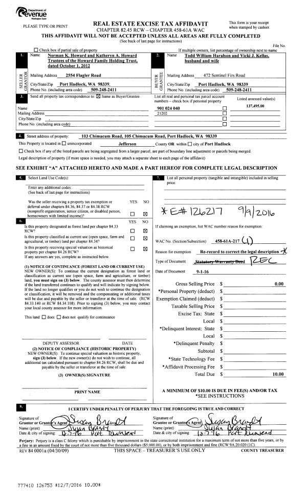 | 2 | 09/01/2016 | REC | Real Estate Contract | HOWARD FAMILY HOLDING TRUST | TODD W HARALSON | | | $165,000.00 | 126217 | |