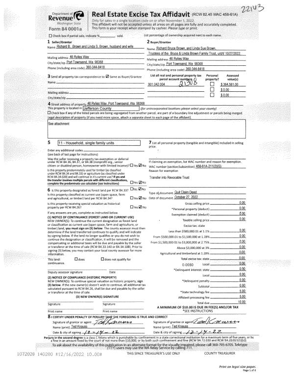 | Mailing Address: | RICHARD B BROWN TRUSTEE LINDA S BROWN TRUSTEE 46 RYLIES WAY PORT TOWNSEND, WA 98368-9106 | % Ownership: | 100.0000000000% |