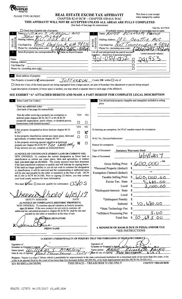 | 1 | 06/14/2017 | SWD | Statutory Warranty Deed | WILLIAM S MARLOW | ANNE E PAINE | | | $600,000.00 | 127871 | |