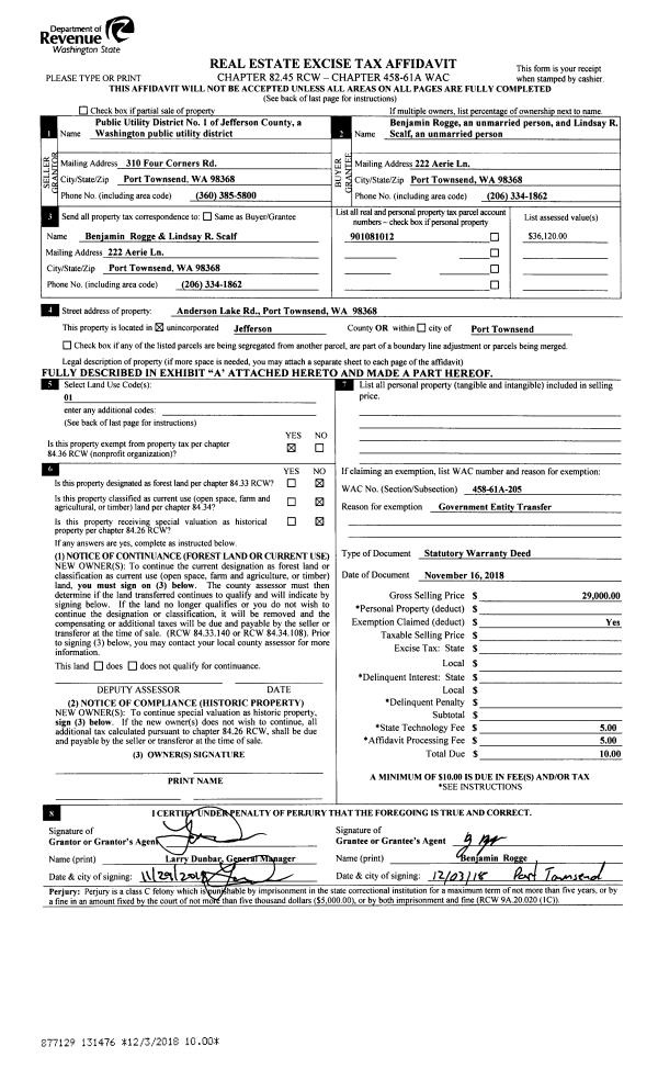 | 1 | 11/16/2018 | SWD | Statutory Warranty Deed | JEFFERSON COUNTY PUD #1 | BENJAMIN ROGGE | | | $0.00 | 131476 | |