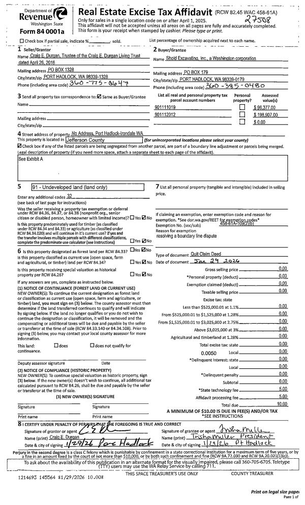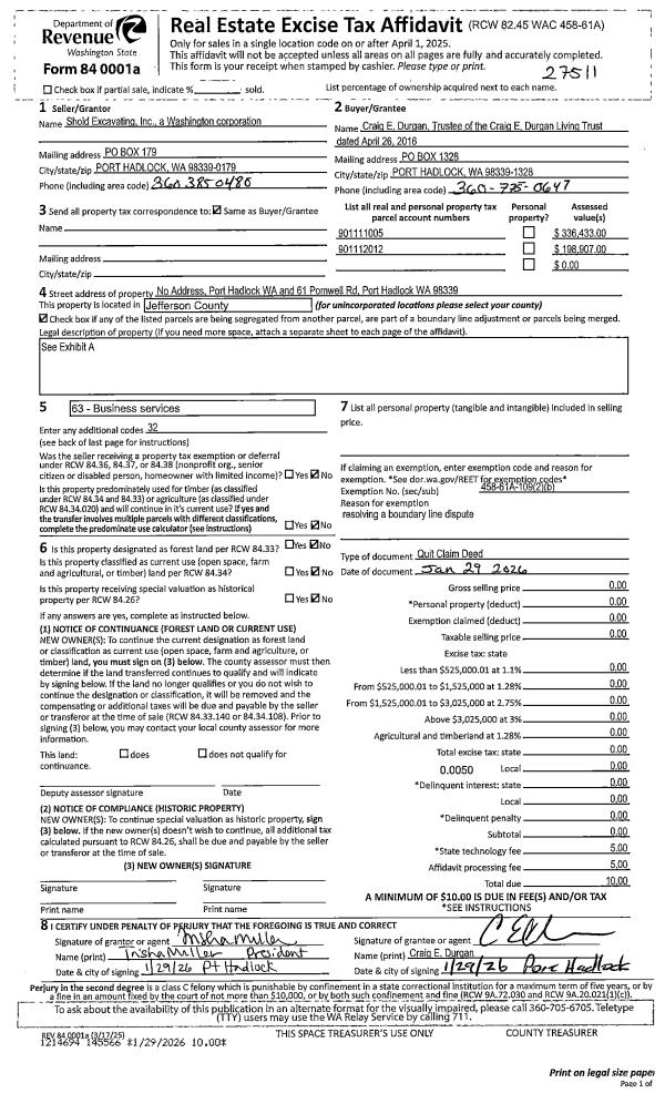 | 1 | 4240-6285Q | Commercial/Industrial Near Chimacum Rd | 1.0000 | 43560.00 | 0.00 | 0.00 | 0.00 | $73,560 | $0 |