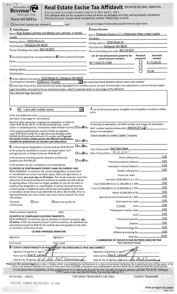 | 1 | 04/11/2022 | QCD | Quit Claim Deed | RYAN E & MARCIE L LAMMERS | PENINSULA HOUSING LLC | | | | 138894 | |