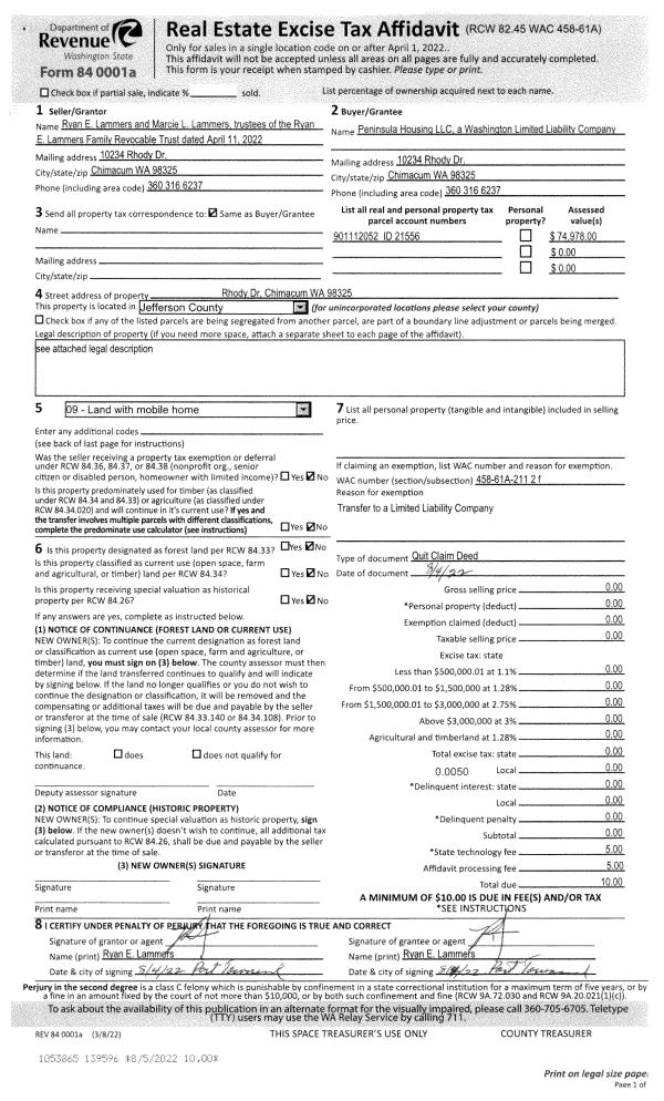 | 1 | 08/04/2022 | QCD | Quit Claim Deed | RYAN & MARCIE LAMMERS FAMILY REVOCABLE TRUST | PENINSULA HOUSING LLC | | | | 139596 | |