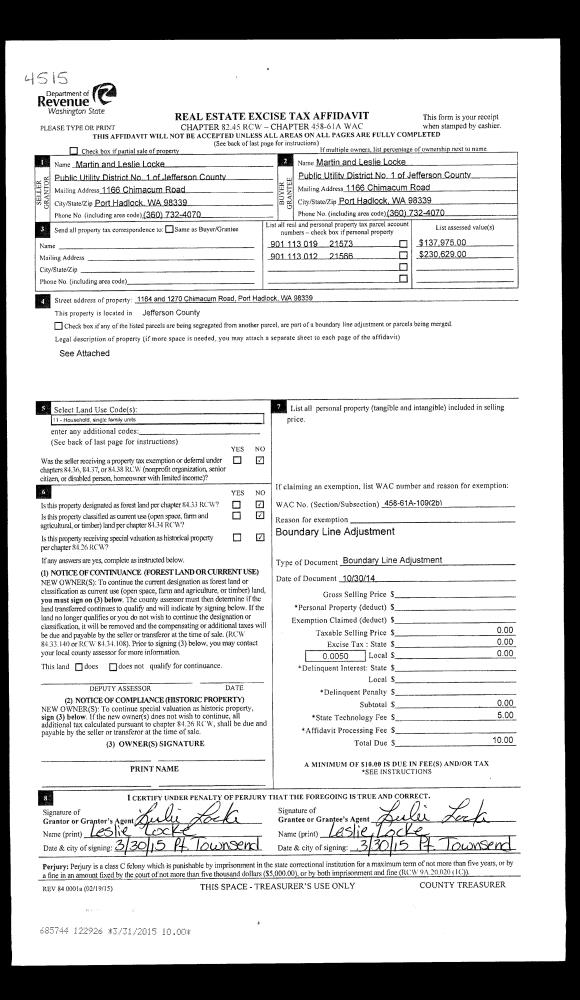 | 2 | 10/30/2014 | BLA | Boundary Line Adjustment | JEFFERSON COUNTY PUD #1 | | | | | 122926 | |