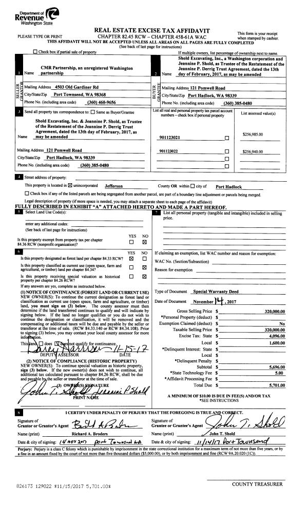 | 4 | 11/14/2017 | SPWD | Special Warranty Deed | CMR PARTNERSHIP | SHOLD EXCAVATING INC | | | $320,000.00 | 129022 | |