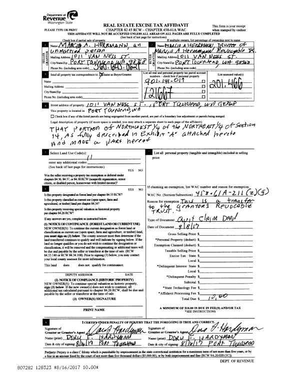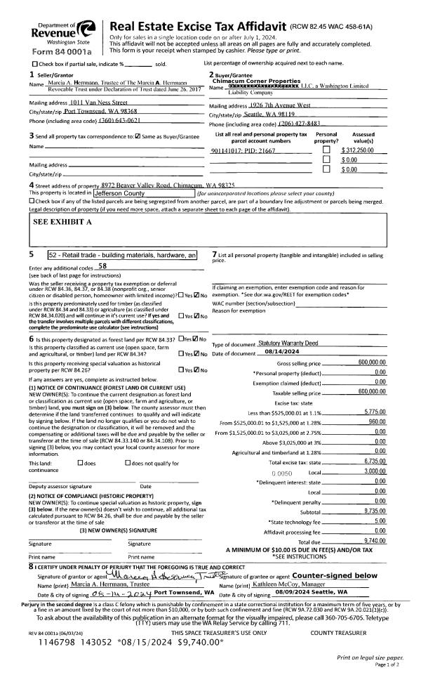 | 1 | 08/14/2024 | SWD | Statutory Warranty Deed | MARCIA A HERRMANN REVOCABLE TRUST | CHIMACUM CORNER PROPERTIES LLC | | | $600,000.00 | 143052 | |
