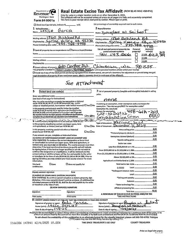 | 1 | 12/11/2024 | WD | Warranty Deed | LESLIE GARCIA | DOUGLAS W SEIBERT | | | | 143841 | |