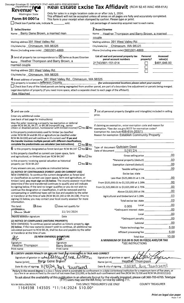| 1 | 11/08/2024 | QCD | Quit Claim Deed | BARRY G BROWN | BARRY BROWN & HEATHER THOMPSON | | | | 143505 | |