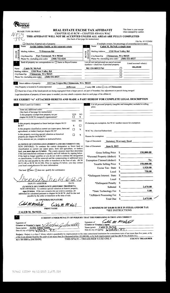 | 1 | 06/08/2015 | SWD | Statutory Warranty Deed | ARCHIE SMITH | CALEB M MC NEIL | | | $150,000.00 | 123349 | |