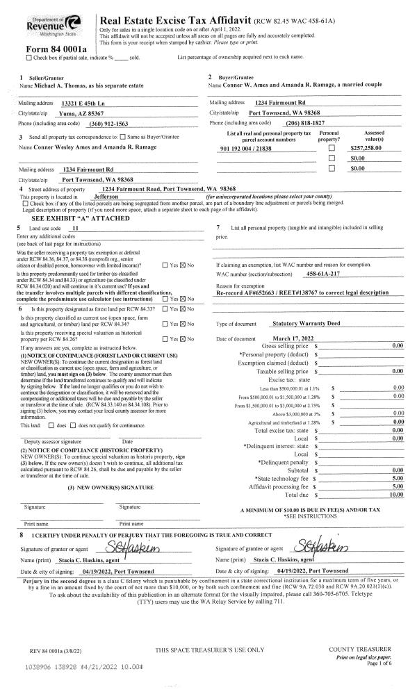 | 1 | 03/17/2022 | SWD | Statutory Warranty Deed | MICHAEL A THOMAS | CONNER W AMES & AMANDA R RAMAGE | | | | 138928 | |