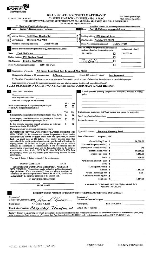 | 2 | 08/03/2017 | SWD | Statutory Warranty Deed | JAMES P KEEN | PAUL MC COLLUM | | | $90,000.00 | 128290 | |