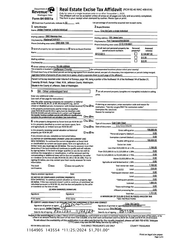 | 1 | 11/22/2024 | QCD | Quit Claim Deed | JORDAN FREEMAN | GINO MCCARTY | | | $106,000.00 | 143554 | |
