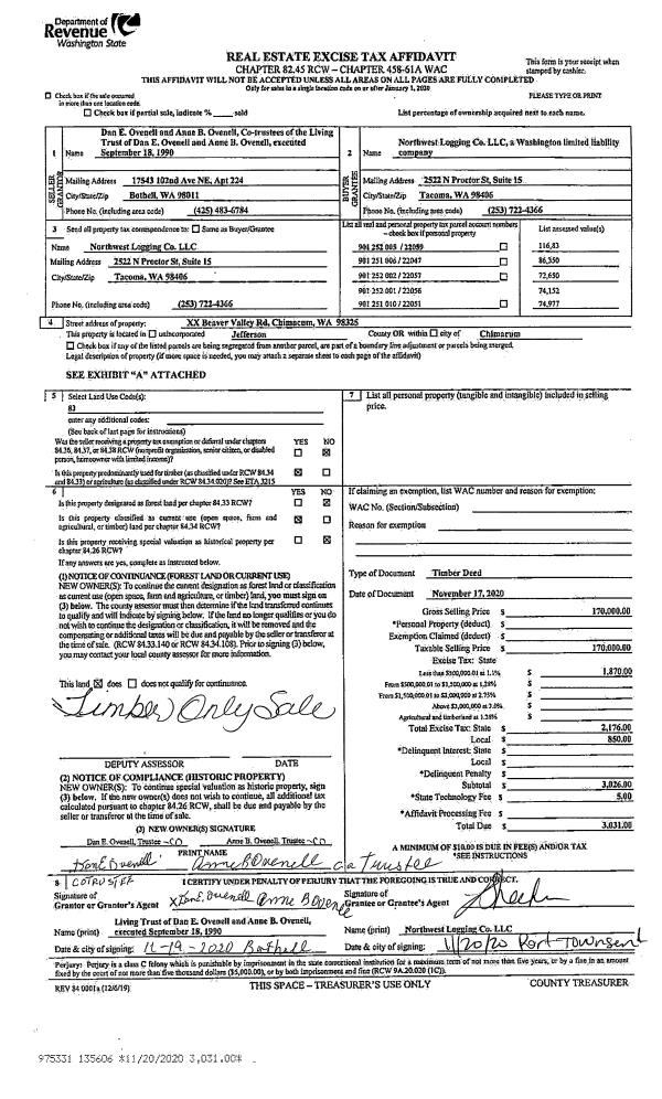 | 1 | 11/17/2020 | TMBD | Timber Only Deed | DAN E OVENELL TRUSTEE | NORTHWEST LOGGING CO LLC | | | $170,000.00 | 135606 | |