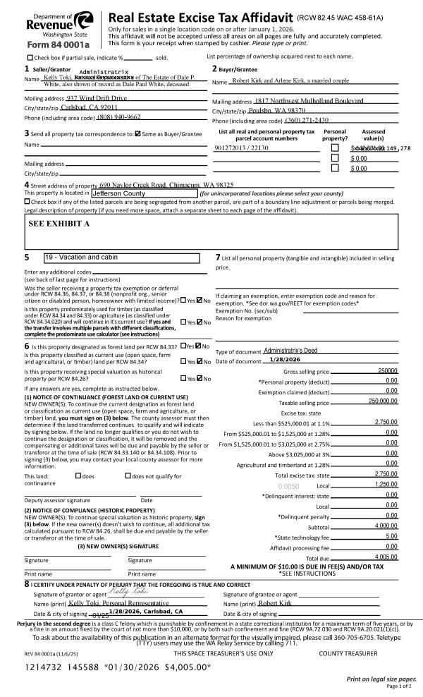 | 1 | 01/28/2026 | ADM | Administrator Deed | DALE P WHITE | ROBERT & ARLENE KIRK | | | $250,000.00 | 145588 | |