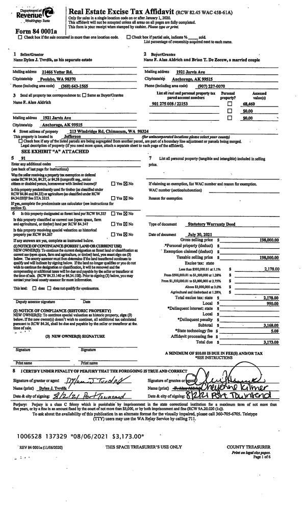 | 1 | 07/30/2021 | SWD | Statutory Warranty Deed | DYLAN J TVRDIK | F ALAN ALDRICH & BRIAN T DE ZEEUW | | | $198,000.00 | 137329 | |