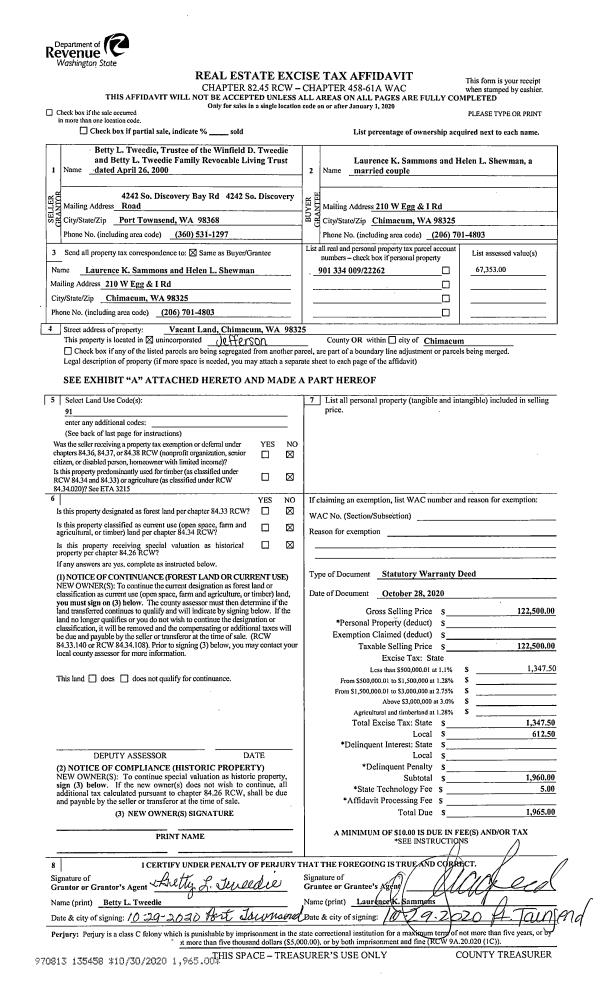 | 1 | 10/28/2020 | SWD | Statutory Warranty Deed | WINFIELD D TWEEDIE TRUSTEE | HELEN L SHEWMAN | | | $122,500.00 | 135458 | |