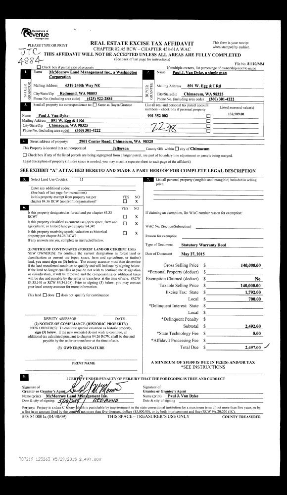 | 1 | 05/27/2015 | SWD | Statutory Warranty Deed | MC MORROW LAND MANAGEMENT INC | PAUL J VAN DYKE | | | $140,000.00 | 123263 | |