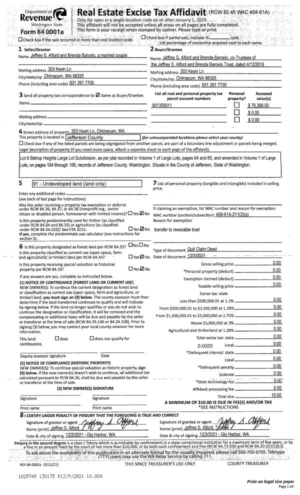 | 2 | 12/03/2021 | QCD | Quit Claim Deed | JEFFREY S ALFORD & BRENDA BARCELO | JEFFREY S ALFORD & BRENDA BARCELO TRUST | | | | 138175 | |
