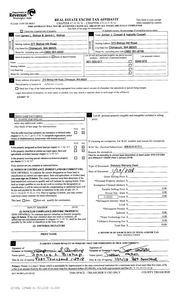 | 1 | 01/01/2018 | SWD | Statutory Warranty Deed | JAMES L BISHOP | JORDAN & ISABELLA COSSELL | | | $400,000.00 | 129329 | |