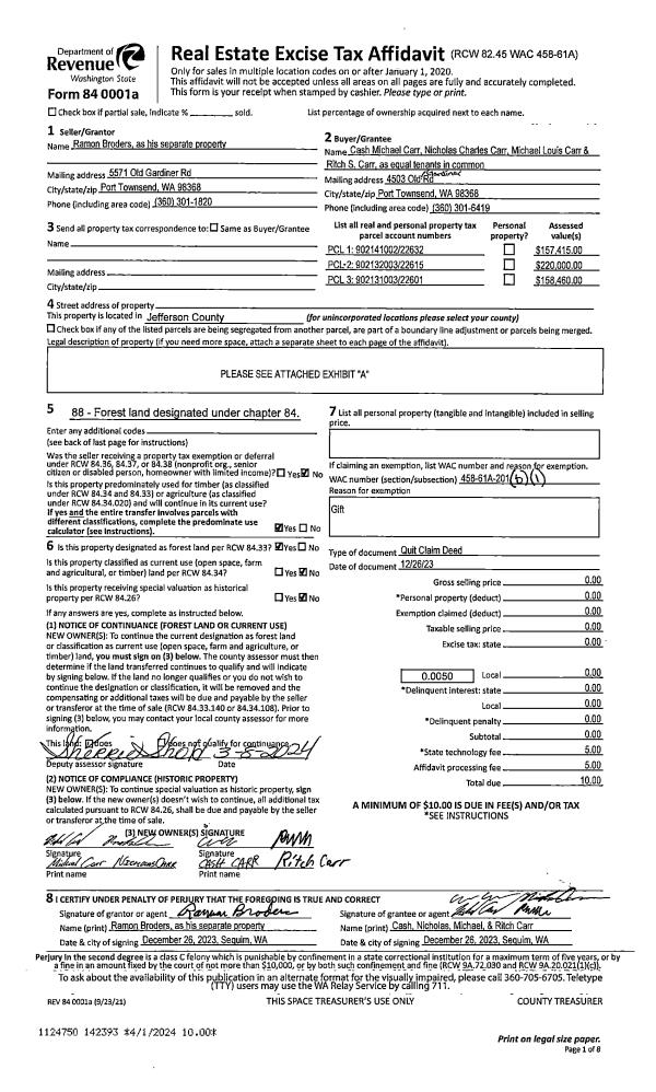| 1 | 12/26/2023 | QCD | Quit Claim Deed | RAMON F BRODERS | CASH M CARR | | | | 142393 | |