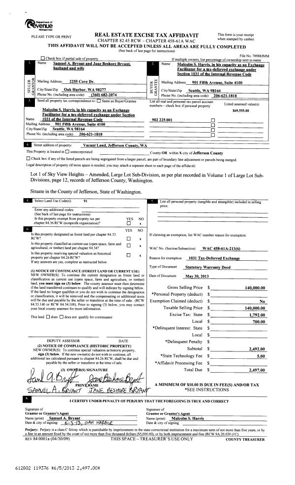 | 1 | 06/05/2013 | SWD | Statutory Warranty Deed | SAMUEL A BRYANT | MALCOLM S HARRIS | | | $140,000.00 | 119376 | |