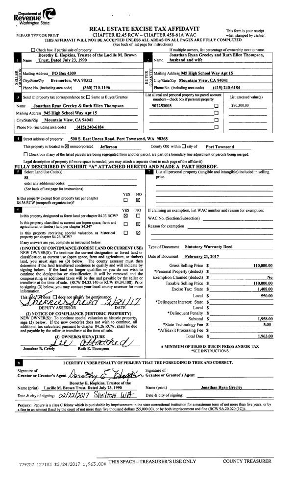 | 1 | 02/21/2017 | SWD | Statutory Warranty Deed | LUCILLE M BROWN TRUST | JONATHAN R GREELEY & RUTH E THOMPSON | | | $110,000.00 | 127183 | |