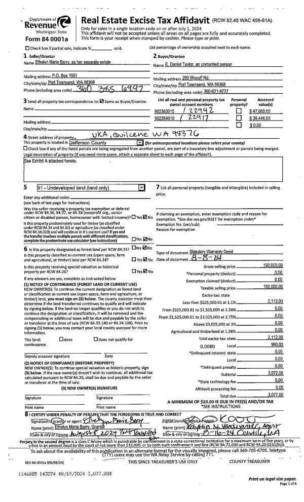 | 2 | 08/08/2024 | SWD | Statutory Warranty Deed | ETHELYN BARRY | E DANIEL TAYLOR | | | $192,000.00 | 143074 | |