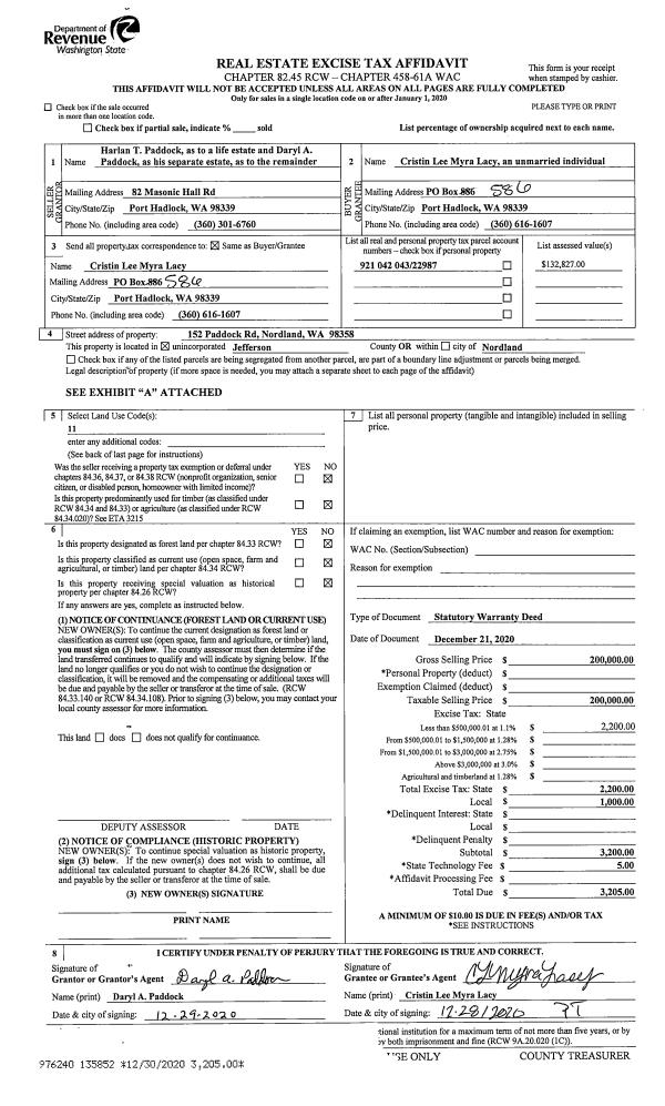 | 1 | 12/21/2020 | SWD | Statutory Warranty Deed | DARYL PADDOCK | CRISTIN L M LACY | | | $200,000.00 | 135852 | |