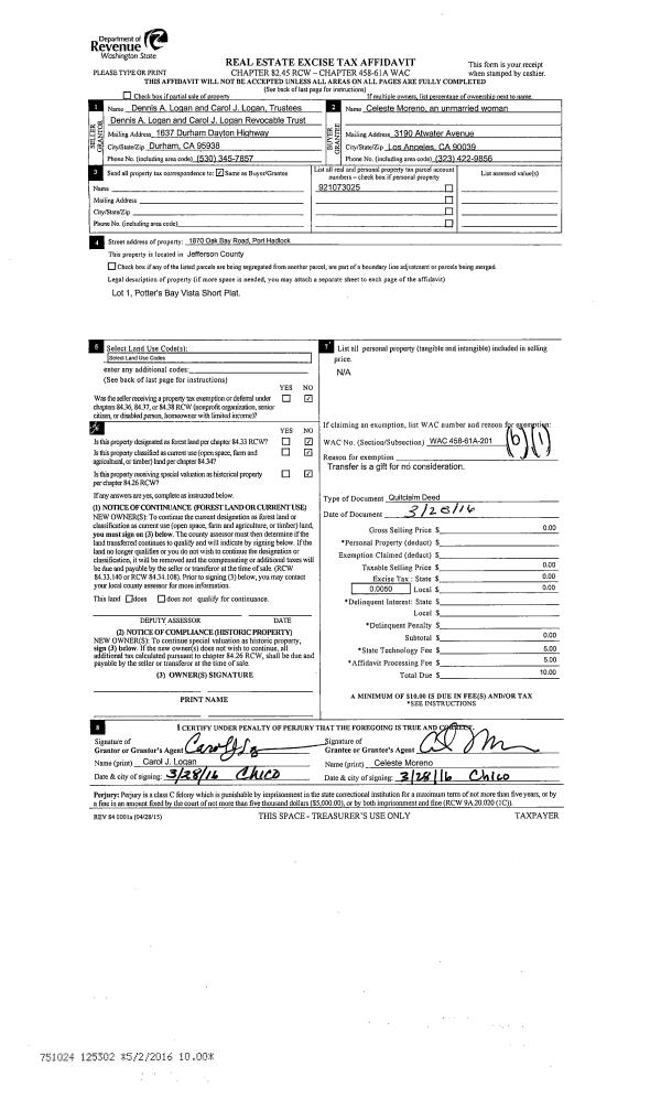| 1 | 03/28/2016 | QCD | Quit Claim Deed | DENNIS & CAROL LOGAN REV TRUST | CELESTE MORENO | | | | 125302 | |